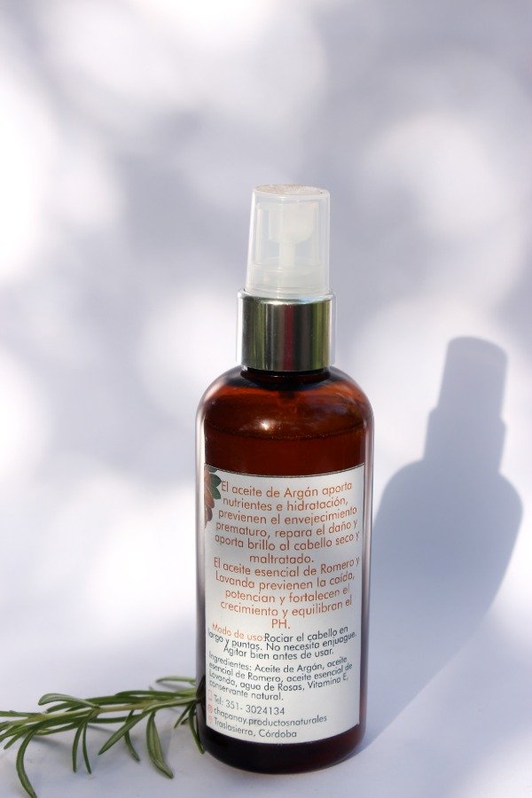 Ingredientes: Aceite de Argán, aceite esencial de Romero, aceite esencial de Lavanda, agua de Rosas, Vitamina E, conservante natural.